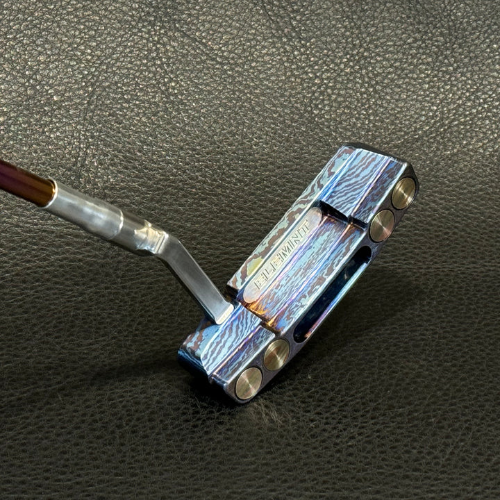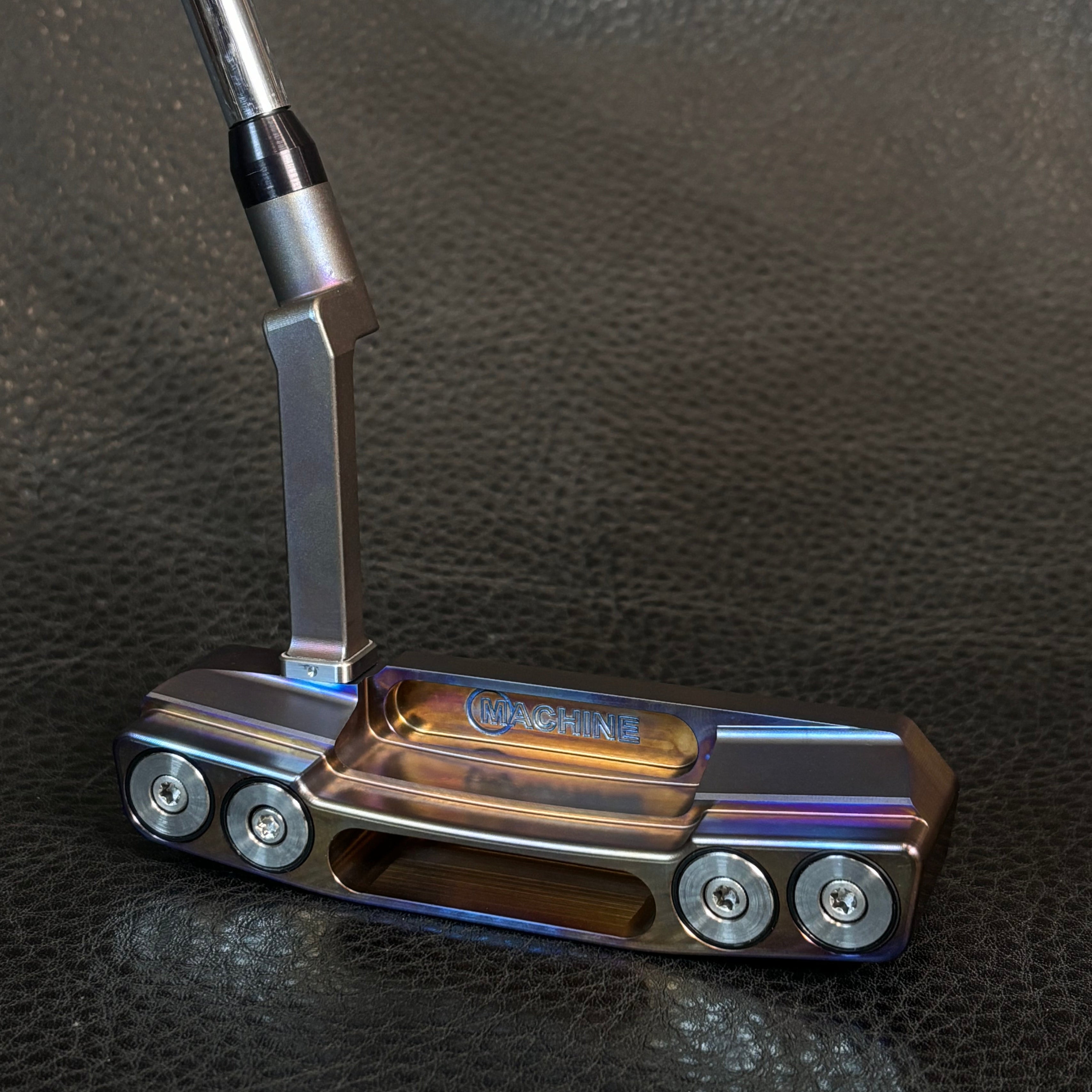 This MACHINE features a Custom Forged Titanium Damascus Head with a hand torched and rubbed finish paired with a Custom Engraved Mokume Medallion and Custom Milled Mokume Weights.