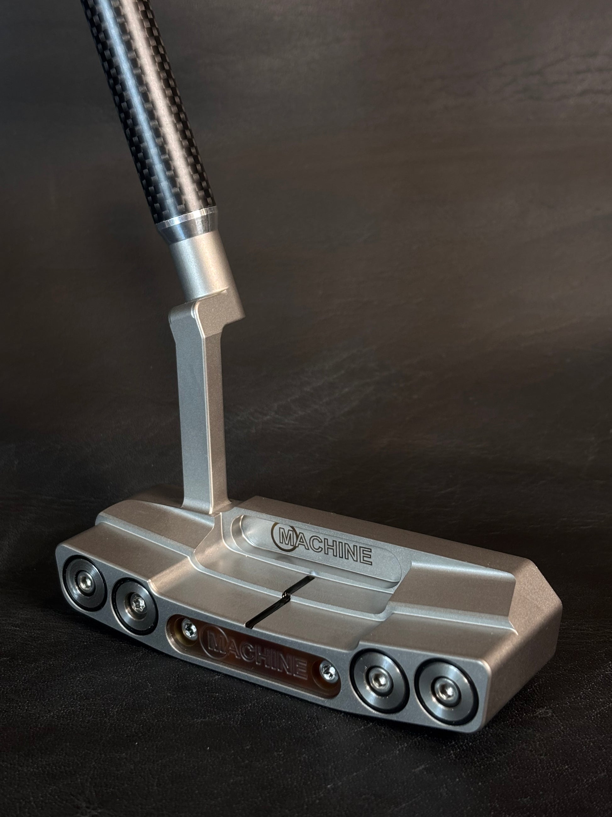 MACHINE M3A WideBody Blade Putter in Grade 5, 6AL-4V Titanium head. This putter includes a Standard Length, Full Offset X-Changer Plumber Neck Hosel in grade 5, 6AL-4V Titanium, with 4 Tungsten Monster Weights. This model features laser engraved make and model markers and Morning Dew Satin Bead Blast Finish. Customizable for shaft, length, loft & lie via Delta Mods or old school bending.
